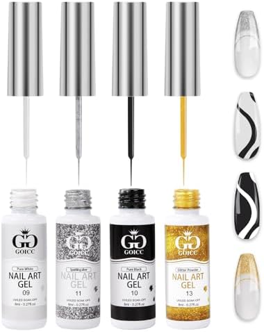Nail Art Polish Set Gel Liner Nail Art Kit For Nail Design Polish Gel Art Paint For Nail 4 Colors Black White Glitter Silver Gel Nail Polish Soak off Curing Requires 8ml with Thin Nail Art Brush