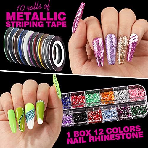 Collect the Most Common Nail Decorations: 1 box nail foils, 1 box 12 colors nail rhinestone, 1 box clear nail stones in 3 sizes and 10 rolls nail striping tape line, you can use tweezer to tear foils then apply on nails to create personal design, place nail rhinestone to decorate nail surface, stick nail tapes on nails to do nail art